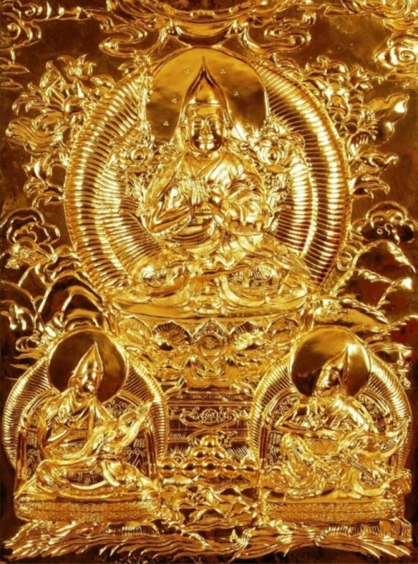 國家寶藏(NATS)「慈愛 智慧 圓滿 和平」佛導師 大智文殊化身 宗喀巴大師暨師徒三尊3D七層次立體金身是西元七世紀以來全球第一幅3D七層次立體金身唐卡且可保存數千年,金身唐卡畫面莊嚴,斷塑法雕塑技術精湛、此銅雕藝術為北京雍和宮與塔爾寺圖騰設計。格魯派始祖宗喀巴大師為達賴喇嘛與班禪大師祖師,同時是文殊大菩薩化身,雙手作說法印,同時持有兩朵蓮花,智慧之劍和《般若波羅密多經》分別托於蓮花之上。兩側為其兩大第子,賈曹杰位於左,克珠杰位於其右。